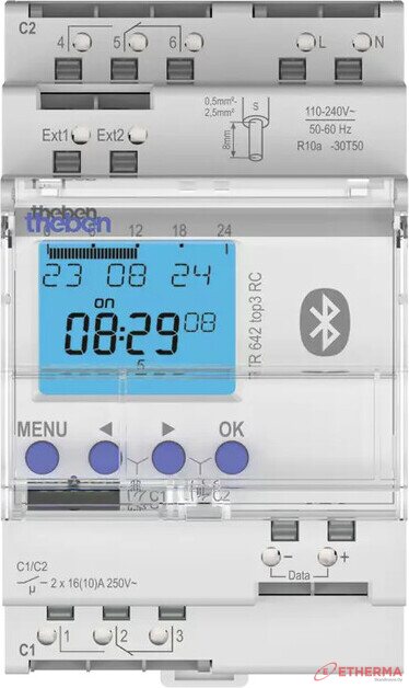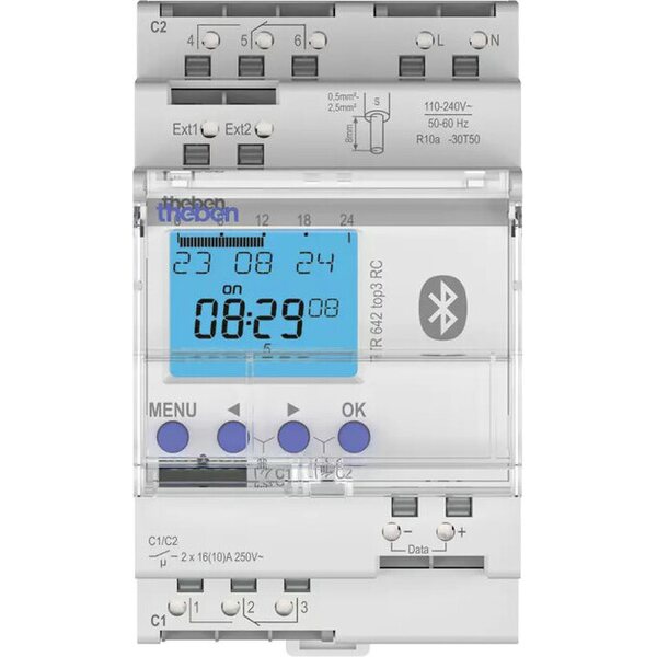 Digitaalinen kellokytkin vuosi- ja Astro-ohjelmalla App-ohjelmointi mahdollista integroidun BLE-moduulin ansiosta Laajat vuotuiset ajanvaihtotoiminnot Tähtitieteellinen kytkentätoiminto (auringonnousu- ja -laskuajankohtien automaattinen laskenta koko vuodeksi) Astro valittavissa kanavakohtaisesti ”3 astroaluetta: auringonlasku, iltahämärä, pimeys” Earth Hour esiohjelmoitu vuoteen 2044 asti Ajan synkronointi ulkoisen DCF- tai GPS-antennin liitännän kautta, lisäksi paikannus Astro-ohjelmalle 2 kanavaa Ulkoinen tulo Painikkeet voidaan liittää (ulkoisen kytkennän esivalinta, alaspäin laskeva ajastin) Kytkin voidaan liittää (jatkuvan toiminnan kytkentä PÄÄLLÄ tai POIS) Laajennusmoduuli ja Ethernet-tiedonsiirtomoduuli (LAN) liitettävissä OBELISK-muistikortti sisältyy toimitukseen DuoFix-jousiliittimet 2 johtimelle Yksilankainen tai monilankainen (johdon pääteholkilla tai ilman) Johtimen halkaisija: 0,5 - 2,5 mm² Pistoliitännän irrotusnappi Tekstipohjainen käyttäjän ohjaus näytöllä Päivämäärä ja kellonaika esiasetettu Kaikki toiminnot käytettävissä ilman verkkoliitäntää 800 tallennuspaikkaa Liitäntä OBELISK top2 -muistikortille (PC-ohjelmointi) 2. kytkentäohjelma muistikortilta Ohjelmien kopiointi Ohjelman varmuuskopiointi 8 vuoden varakäynti (litiumakku) Nollapistekytkentä relettä suojaavaan kytkentään ja suurille lamppukuormille (ei 24 V laitteissa) PÄÄLLÄ-POIS -kytkentäajat Impulssiohjelma Sykliohjelma Monipuoliset vuosikellotoiminnot Perusviikko-ohjelma ja 14 erilaista viikko-ohjelmaa prioriteettitasoilla ja päivämääräalueilla Jatkuvasti PÄÄLLÄ / jatkuvasti POIS korkeimmalla prioriteetilla ohjelmoitavissa päivämääräalueittain Kiinteät ja vaihtuvat vapaapäivät, pääsiäiseen sidotut juhlapyhät, päivät ja päivämääräalueet sarjamalleilla Juhlapyhien tietokanta Saksan liittovaltioille, Sveitsille, Ranskalle jne. Ohjelman simulointi kellon näytössä Graafinen ohjelman simulointi koko vuoden yleisnäkymällä kaikille kanaville tietokoneella Astronominen kytkentätoiminto (auringonnousu ja auringonlaskuaikojen automaattinen laskenta koko vuodelle) Korjaus auringonnousu- ja auringonlaskuaikojen mukauttamiseen Sijaintitiedot voidaan ohjelmoida koordinaattien tai maiden kaupunkiluettelon avulla Oman kaupunkiluettelon (suosikkien) ja omien Astro-aikojen taulukon luonti mahdollista tietokoneella Kiinteät PÄÄLLE-POIS -kytkennät ohjelmoitavissa (esim. yökatkaisut) Astro-kytkentäaikojen simulointi (lasketut Astro-ajat ja ohjelmoidut PÄÄLLÄ-POIS -kytkennät) koko vuodelle Erilaiset Astro-asetukset valittavissa (iltaisin PÄÄLLÄ - aamuisin POIS tai iltaisin POIS - aamuisin PÄÄLLÄ, Astro-impulssi) Kytkennän esivalinta Jatkuvan toiminnan kytkentä PÄÄLLÄ/POIS Alaspäin laskeva ajastin Sisäänrakennettu käyttötuntilaskuri Nollausmahdollisuus Huoltotoiminto huoltoaikojen valvontaan Lomaohjelma 2 vaihtelevaa ohjelmaa Näytön valaistus (voidaan kytkeä pois) PIN-koodaus Automaattinen kesä- ja talviajan vaihto Voidaan ottaa pois käytöstä Vaihtokytkentäsäännöt Euroopalle, USA:lle ja muille maille on jo tallennettu Omat vaihtokytkentäsäännöt tai vaihtokytkentä kiinteän päivämäärän mukaisesti valittavissa
