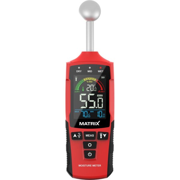 Nastaton kosteusmittari (Pallokoetin) -Rikkomaton testaus: Nastaton sähkömagneettinen anturi havaitsee kosteuden (0-80 %:n alue) vahingoittamatta pintoja. -Korkea tarkkuus: ±2 % virhemarginaali; toimii puulle, betonille, kipsilevylle, kaakeleille ja kipsille. -Kestävä ja kompakti: ABS+PC iskunkestävä runko -Kirkas näyttö: Taustavalaistu LCD-näyttö, jossa on värikoodatut hälytykset (vihreä/keltainen/punainen).
