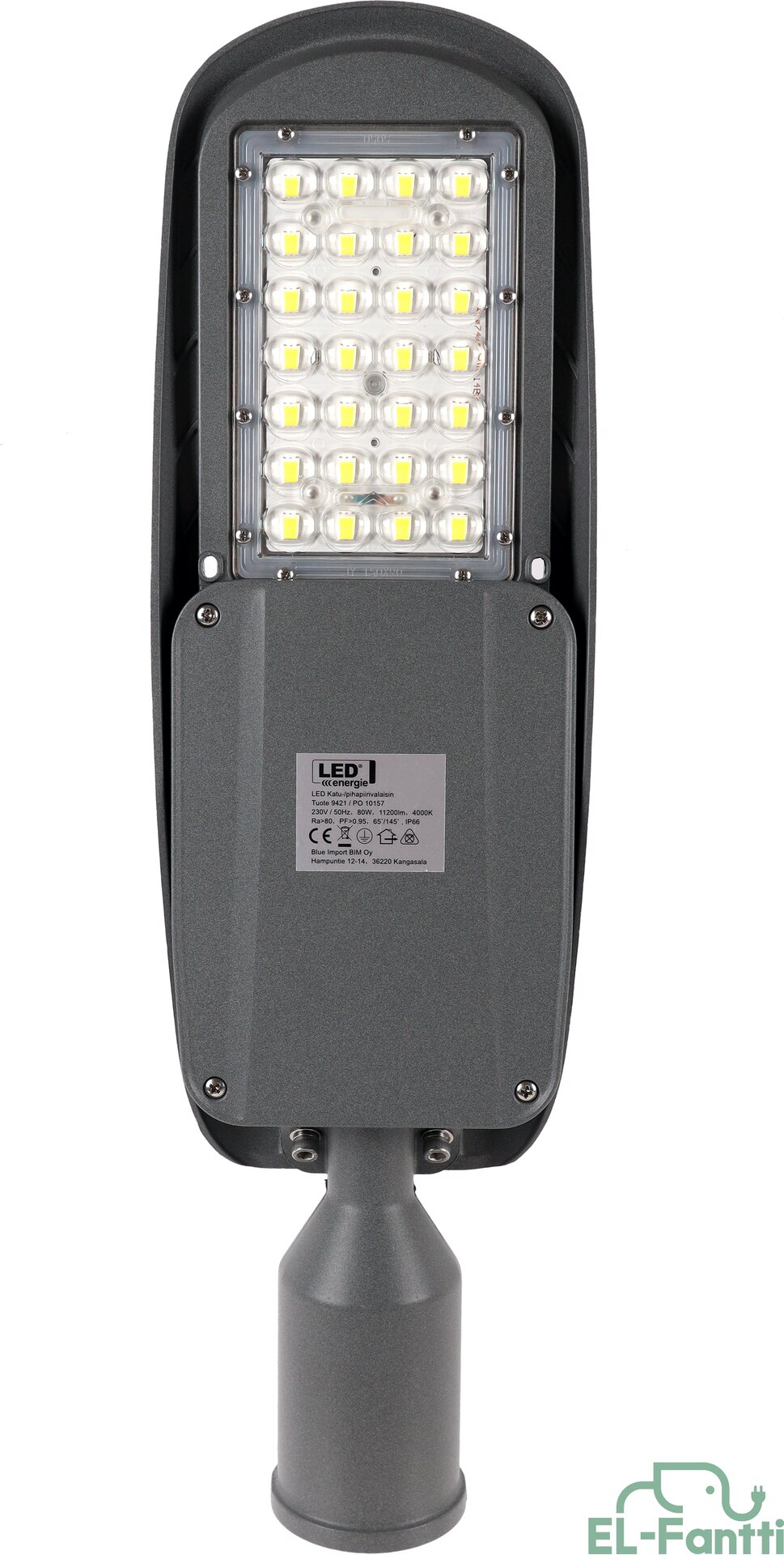 Philips 5050 LED-moduuli. Linssioptiikka, katuvalo-optiikka. Valonjakokulma 65/145°. 80W, 11200lm, PF>0,95, 4000K, Ra>80. IP65, IK09. Käännettävä asennussovite pylvään päähän tai varteen. Mitat: 535x150x76 mm. 1,6 kg. Kaapeli 6 m. Tekniset tiedot: Käyttöjännite: AC100-277V Teho: 80W Valovirta: 11200lm Valotehokkuus: 130lm/W Värilämpötila: 4000K Värintoistoindeksi: Ra>80 PF: >0,95 Käyttölämpötila: -30˚C - + 45˚C Elinikä: 50 000 h Valonjakokulma: 65˚ / 145˚ Mitat: 535 x 150 x 76 mm Paino: 1,6 kg Kaapelin pituus: 6m Kotelointi: IP65 Iskunkestävyys: IK09 Materiaali: alumiini Hyväksynnät: CE, EMC, RoHs, LVD Tuotetakuu: 3 vuotta