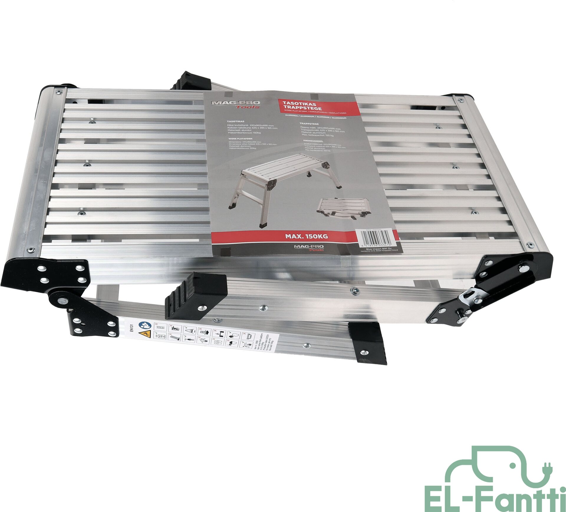 Kompakti tasotikas tarjoaa turvallisen ja vakaan työalustan kotitalouksiin. Tikas on valmistettu kevyestä mutta tukevasta alumiinista, mikä tekee siitä helposti siirrettävän ja käytännöllisen eri työskentelytilanteissa.