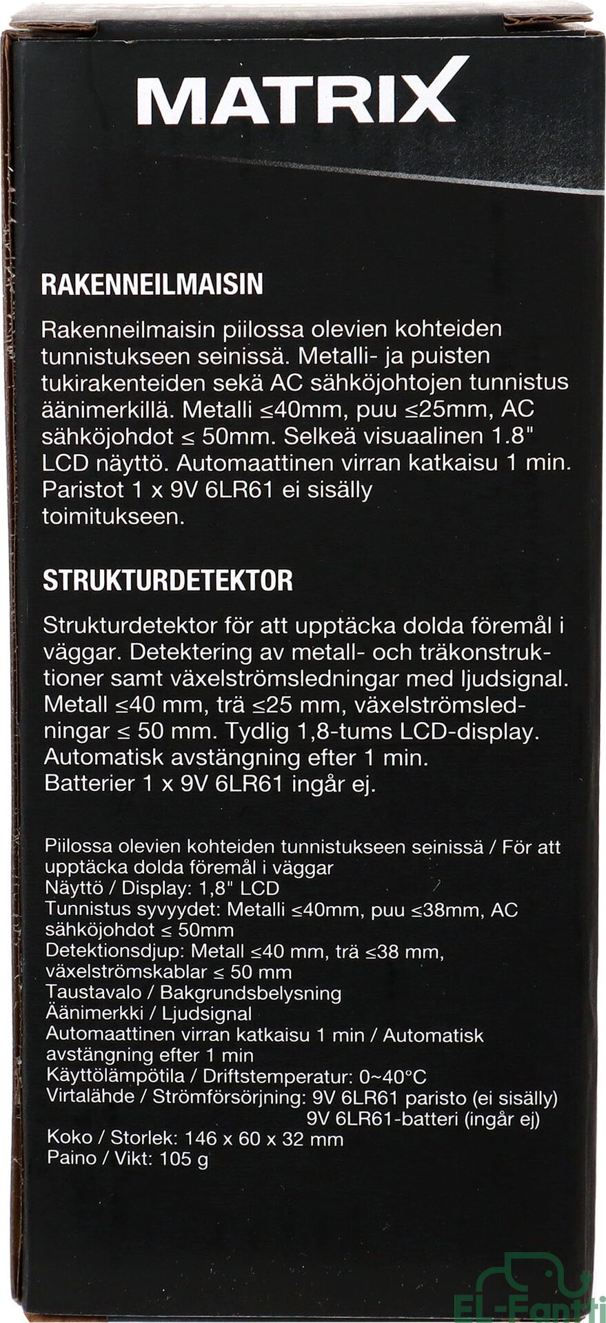 Rakenneilmaisin on luotettava apuväline piilossa olevien kohteiden paikantamiseen. Tämä kompakti ja helppokäyttöinen rakenneilmaisin auttaa löytämään seinien sisällä piilevät rakenteet ja johdot nopeasti ja tarkasti. Laite tunnistaa metalli- ja puutukirakenteet sekä AC-sähköjohdot, antaen selkeän äänimerkin löydöstä. Selkeä 1.8" LCD-näyttö näyttää havainnot visuaalisesti, ja automaattinen virrankatkaisu säästää paristoa. Sopii monenlaiseen käyttöön, kun haluat varmistaa turvallisen poraamisen, sahauksen ja muun remontoinnin.