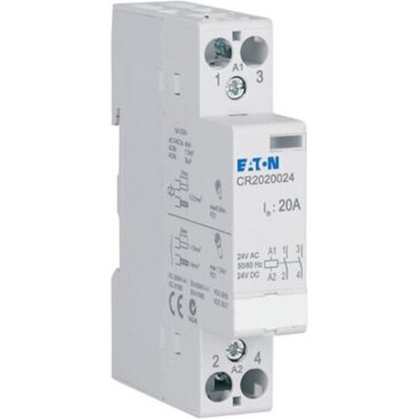 Asennuskontaktori, ohjauspiirin nimellisjännite 24V AC/DC, nimelliskäyttövirta AC1:ssä 20A, toiminto: 2 NO, yksityiskohdat IEC/EN 61095, IEC/EN 60947-4-1:n mukaan